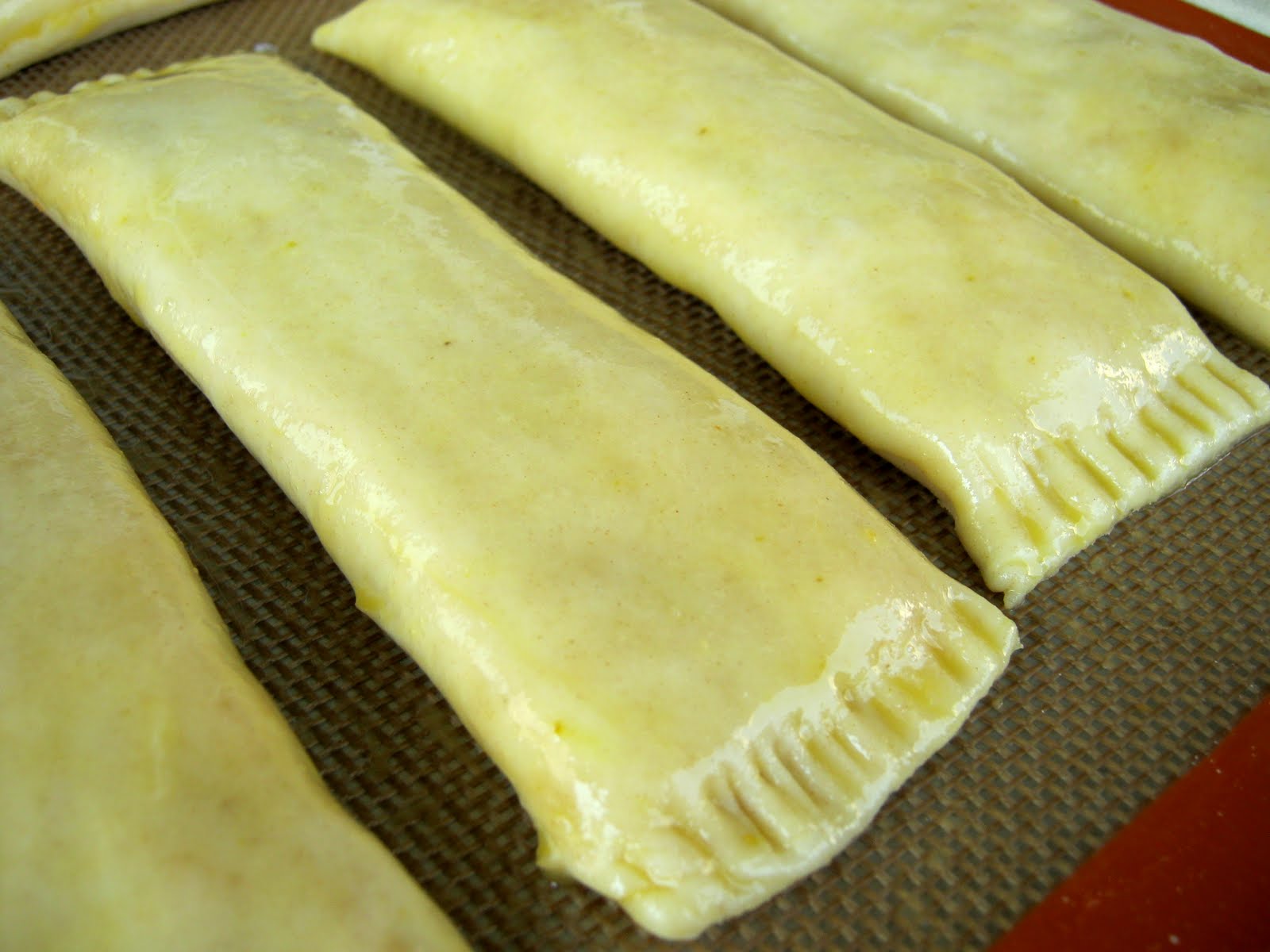 - Χτυπάτε το ασπράδι αυγού και με ένα πινέλο βουρτσίζετε περιμετρικά τη ζύμη εσωτερικά. Πασπαλίζετε την άκρη της μεγαλύτερης πλευράς της ζύμης με 1 κ.σ. γέμιση τυριού και διπλώστε. Προσθέστε άλλη 1½-2 κ.σ. μείγμα τυριών, βουρτσίστε με λίγο ασπράδι αυγού, “σφραγίστε” και διπλώστε έτσι ώστε η ραφή είναι στο κάτω μέρος. Με ένα πιρούνι, πιέστε τις 2 πλευρές και κόψτε τη ζύμη που προεξέχει με ένα μαχαίρι για καλύτερο οπτικό αποτέλεσμα.
